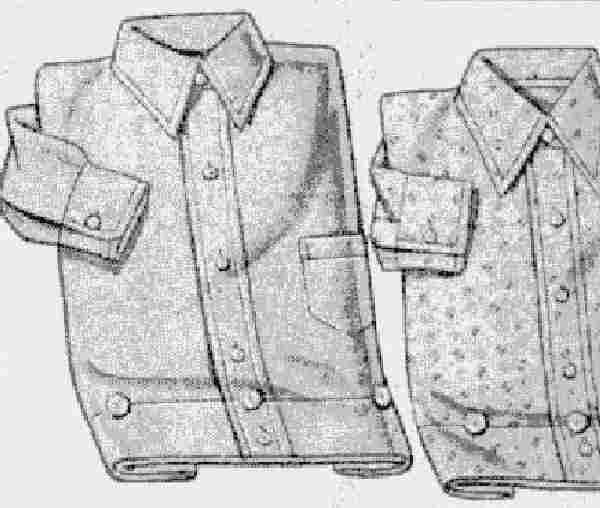 The ad copy read, "Very practical waists [i.e. shirts] with large buttons at the bottom to button to the little pants. All fast color cotton broadcloth materials. Lined collars and cuffs, sleeve facings. Open cuffs to button. Long sleeves and