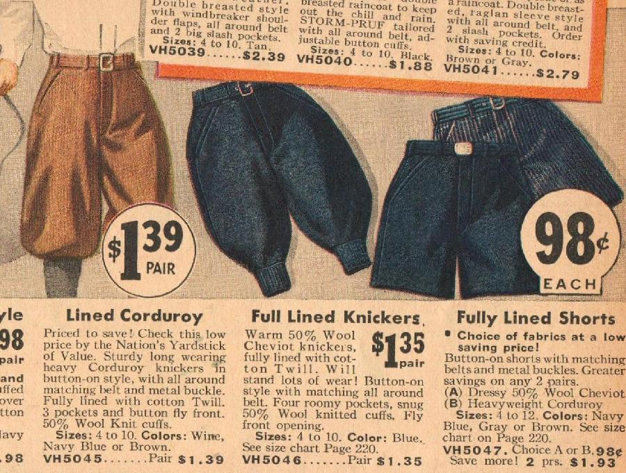 The Spiegal ad copy read, "Priced to save! Check this low price by the Nation's Yardstick of Value. Stirdy long wearing heavy Corduroy knickers in button-on style, with all around matching belt and metal buckle. Fully lined with cotton Twill. 3 pockets and button fly front. 50 % Wool Knit cuffs. Sizes: 4 to 10. Colors: Wine, Navy Blue or Brown. VH5045... Pair $1.39."