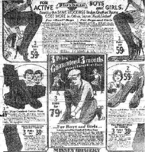 tree--over the back fence--there he goes running through the alley and when he comes home you don't know he's the same boy you sent out so nice and clean. Made with two-thread legs with a third thread knit into the knee and extending to the top. Smooth, seamless feet for comfort and reinforced heels and toes for wear. Knit of fine ribbed cotton of a good seviceable weight. Saves lots of mending because it lasts so long. Stands all your boy's rough and tumble wear. Exactly the same quality stocking you will see selling for more money most stores. 3 Pairs for 59 c." [Note the large sizes--10 and 10 1/2--large enough for older teenagers.]