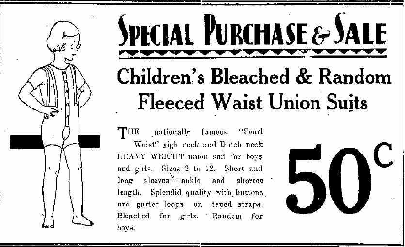 The ad text read, "Special Purchase & Sale. Children's Bleached & Random Fleeced Waist Union Suits. The nationally famous "Pearl Waist" high neck and Dutch neck [cut lower so that underwear wouldn't show if collars were left