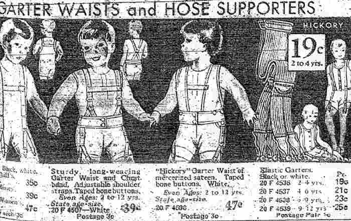 Three types of boys' and girls' garter waists plus the famous Hickory hose supporters sold separately. The ad appears in Ward's Spring and Summer catalog for 1933, p. 91. The section was labeled, "Garter Waists and Hose Supporters".