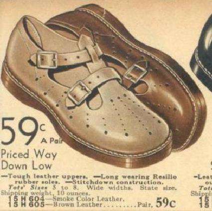 Double strap sandals were offered in two sizes. The ad copy read, "59c A Pair. Priced Way Down Low. --Tough leather uppers. --Long wearing Resillo rubber shoes. --Stitchdown construction. Tots' Sizes 5 to 8. Wide withs. State size. 15H604--Smoke Color Leather, 15H605--Brown Leather ... Pair, 59c" There was no mention as to gender, but I believe this style would have been seen as appropriare for boys, at least younger boys, and girls. They would have been mostly worn by pre-school boys, but a few younger boys may have worn them to school.