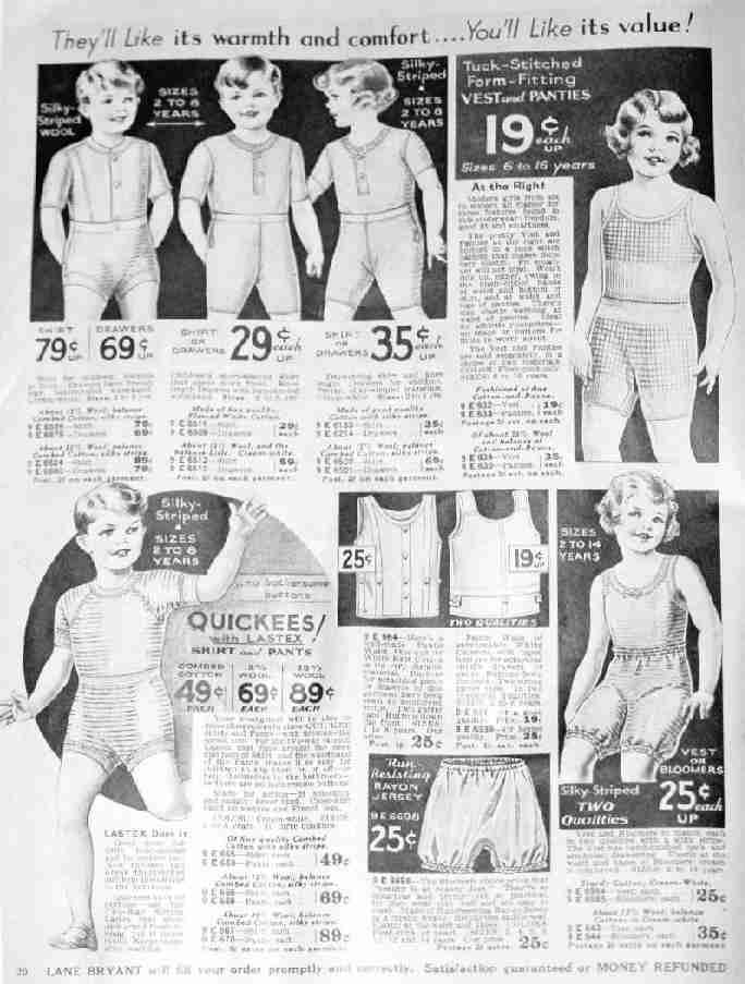 We are not familiar with Lane Bryant. We have new other entries from this mail-order company. Here we see the transition from pre elastic stitching to elastic knit stretch materials we probably take for granted. The shirts did not have enough stretch to have band necks to go over one's head so buttons were necessary to accommodate the head. These buttons then had to be rebuttoned once worn which was more work. Even more was the fact that drawers or pants, bloomers or panties all had to be buttoned to something to stay up. This presented several inconveniences. First, a garment was needed to hold up one's under pants. That may explain why very young children only had shirts. Infants in the US and children up to 8 in France and maybe some other countries. Second, for young children this meant that someone older had to help with buttons for getting dressed and using the bathroom. It must have been much more common for older children maybe five, six or even an eight year old to require help to use the bathroom.