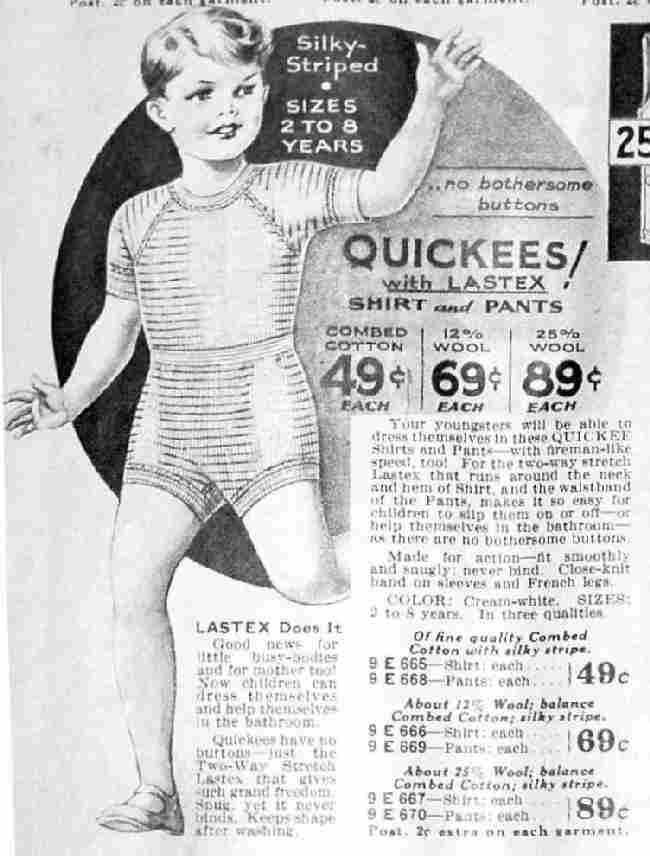 These items were located at the lower left part of the Lane Bryant catalog page. The term Quickeees reflects how wasy and quick it was to dress with underwear that did not have buttons, but rther an elasticized waist. The model suggests that these items were for boys, but the ad copy used the term children and clearly implies they were for both boys and girls as well as mothers. The styling looks very modern.