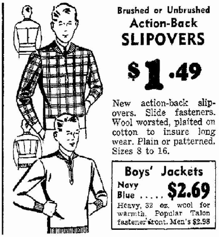 Panny offered two items here a sweater abd aacket. Only the sweater which they called a slipover. The ad copy for the slipover read, "Brushed or Unbrushed Action-Back Slipovers $1.49. New action-back slipovers. Slide fasteners. Wool worsted, plaited on cotton to insure long wear. Plain or patterned. Sizes 8 to 16." These seem to be jackets worn like pullover sweaters. Notice that the illustrations show the boys wearing a shirt and necktie underneath. At first I thought it had a zipper front, but now I am not sure. There is apartial opening, but I an not sure how it fastened.