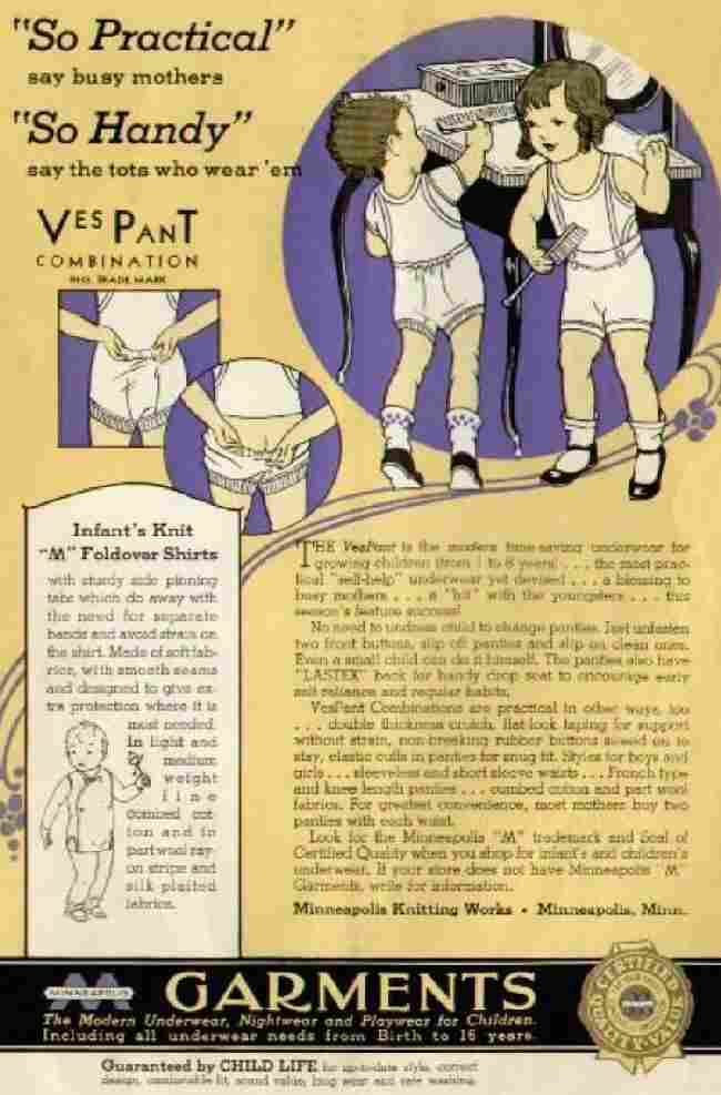 We note that one important underwear manufacturer, Minnesota Mills, offered a new type of underwear which they called VestPant combinations. The underwear was for younger children and as best we can tell, the underpants buttoned on the undershirt.