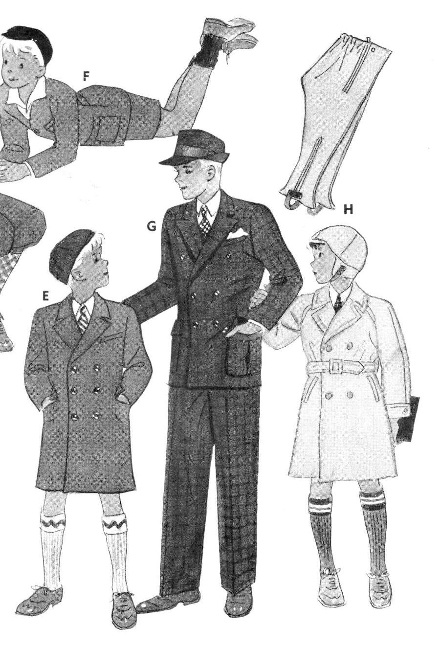 The Marshall Fields 1936 catalog had a page mostly devoted to boys' suits there was this section section with mixed itens, including overcoats, leggings, and long pants suits. This mixed iens for younger and oger bots, although the age sizing overlapped. Here is the ad copy for the varioius items.