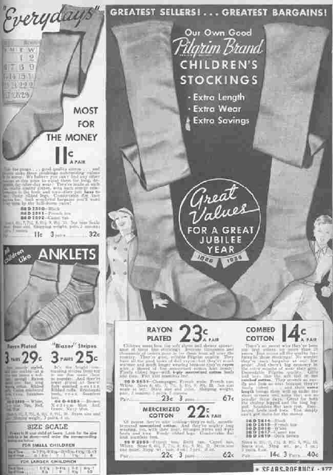Sears offered two styles of long stockings in the Pilgrim brand. The ad copy read, "Greatest Sellers! Greatest Bargains! Our Own Good Pilgrim Brand Children's Stockings: Extra Length. Extra Wear. Extra Savings. Great Values for a Great Jubilee Year 1886-1936.