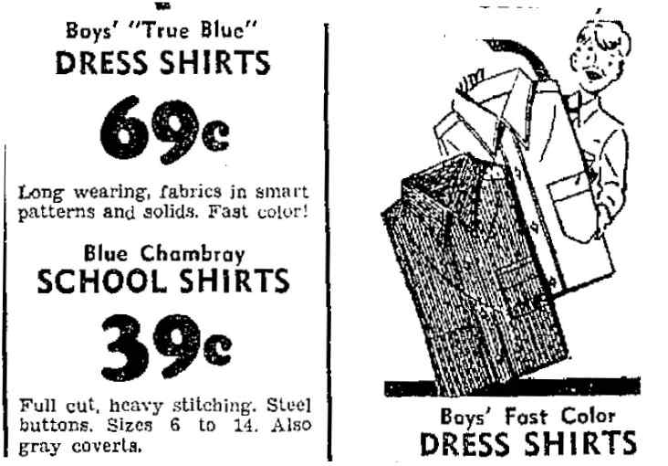 The ad copy read, "Blue Chambray School Shirts, 39 cents. Full cut, heavy stitching. Steel buttons. Sizes 6 to 14. Also gray coverts." I'm not sure what grey coverts were.