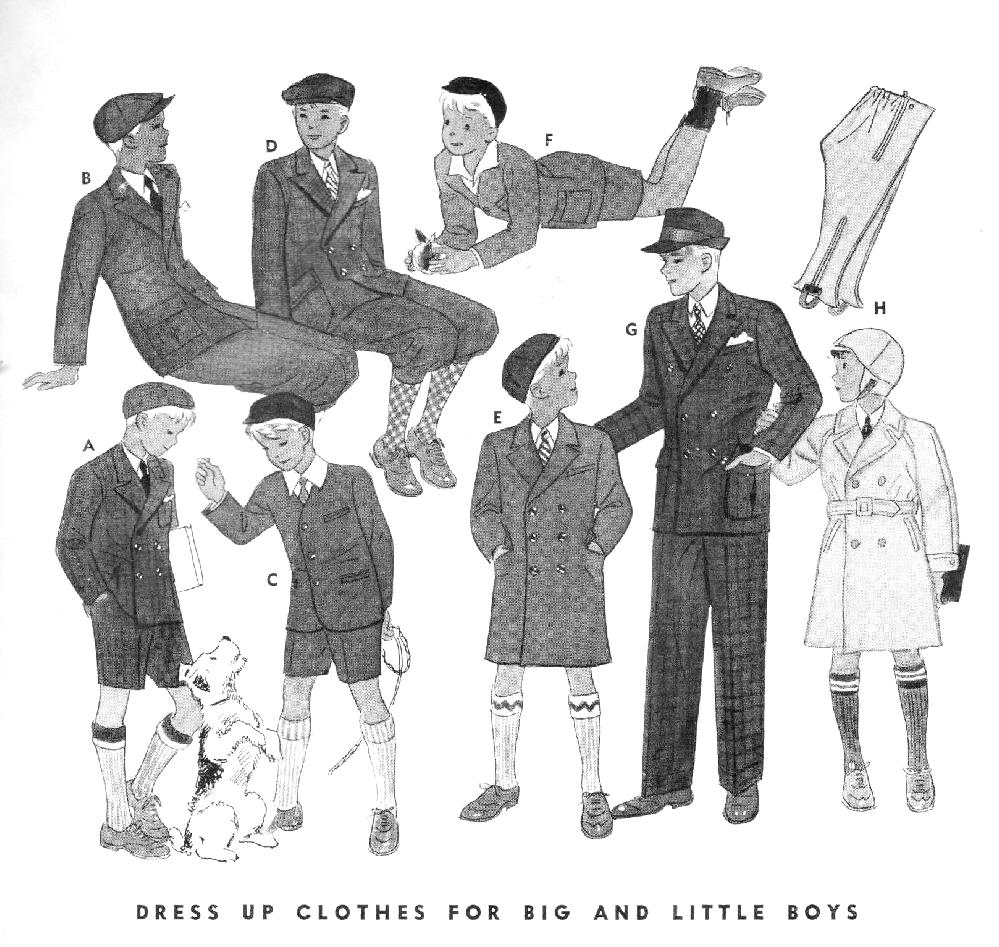 Marshall Fields in 1936 offered short pants suits for younger boys 4-12 years old. The age range of the various suits varied. Most were done only to to 10 years of age. One of the jackets is double-breasted, the other two are Eton jackets. One of the Eton suits is a three-piece suit done with a button-on blouse. The drawing shows two other boys wearing short pants suit, but here Fields is marketing overcoats. Most of the boys wearing shorts and knickers are depicted with knee socks. Onr boy wearing an Eton short pants suit is shown wearing ankle socks. At the time ankle socks were growing on popularity. Long stockings were geneally not worn by schoolage boys and knee socks were beginning to decline in popularity but as shown still widely worn.