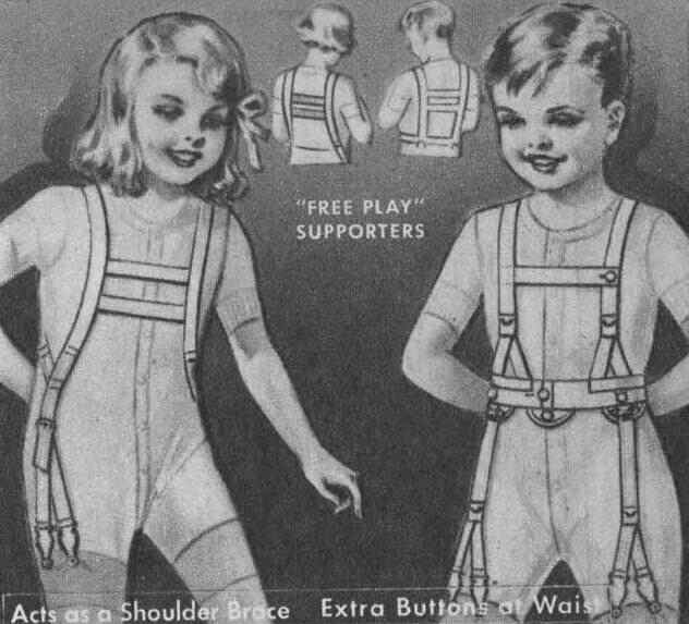 Sears offered Three different grades of pin-on supporters and two types of garter waists for children in its 1936-37 Fall-Winter catalog. Sears described them as "Free Play Supporters", stressing thatt they would not inhibit movement. They also rather curiously described them as a sholder brace. They were considered helpful for good posture. The illustrations show younger children wearing them, presumably because older children were increasingly wearing knee socks and ankle socks. The principal purpose of these garments f course was to hold up long stockings. This was apparently understood because long stockings were hardly mentioned in Sears the ad copy.