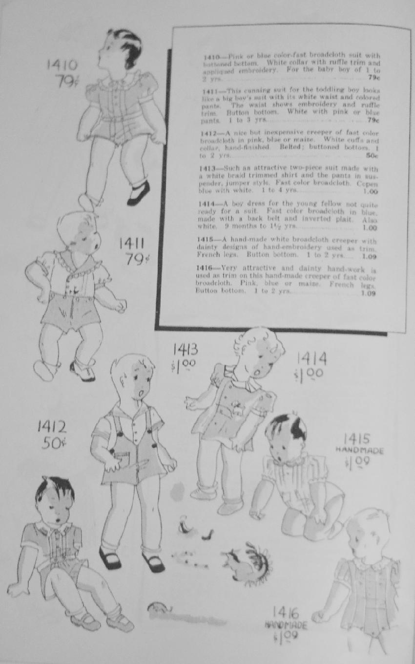 The ad copy read, "A boy dress for the young fellow not quite ready for a suit. Fast color broadclothin blue, made with a back beltand inverted plait. Also white. 9 months to 1 1/2 yrs. ,,,, $1.00." This is the latest example we have found for a boy dress, but notbly it is for a very young boy. Unlike several of the other outfits, this one is not done on pink.