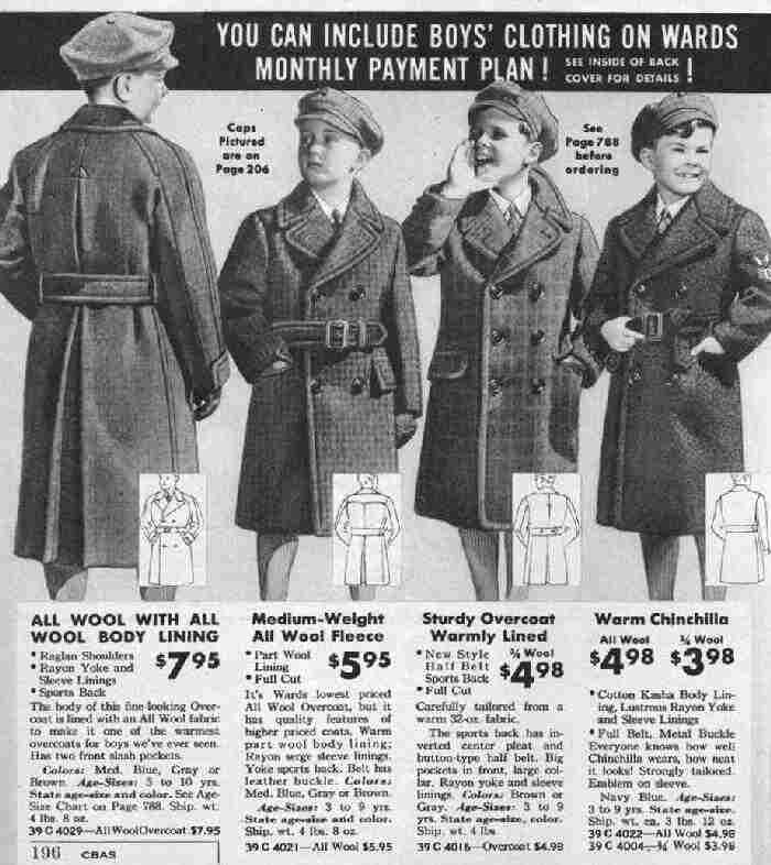 Wards offers five different overcoats for younger boys. The styles, however seem quite similar Most have pocket flaps. Some are belted and some are not. The major difference in the coats seem to be the fabric and pattern. Even the one with a sailor sleeve badge is styled just like the others.