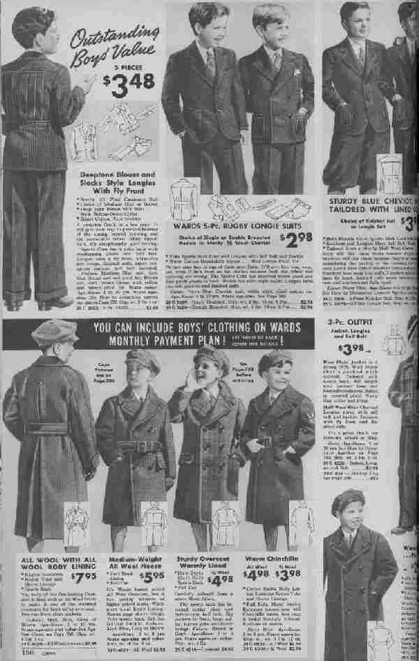 Knickers were still worn, but by younger boys and were declining in popularity. Long pants were becoming increasingly common. The major catalogs in 1937 were giving increasing attention to long pants. Younger boys still wore short pants, especially in the summer. This was in part affected by regional and social-class trends. Note that the models here showing overcoats are shown wearing knickers (figure 1). This despite most of the suits shown on the same page are long pants suits. This is another example of the clothing shown with items is quite often not very accurate.