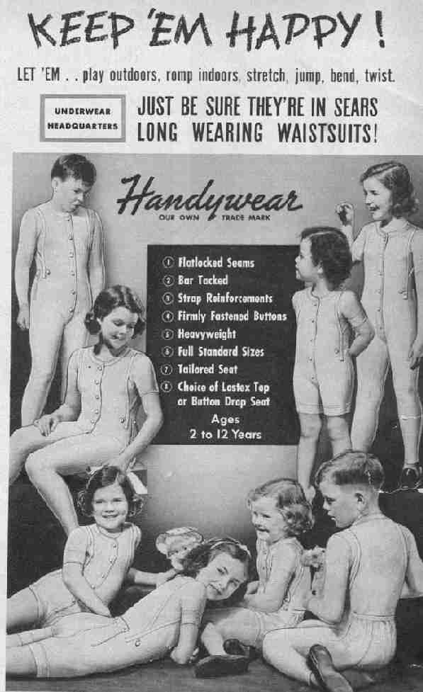 Sears offered a wide range of waist suits for boys and girls in the Handwear store brand. The Sears ad copy read, "Keep 'Em Happy! Let 'Em ... play outdoors, romp indoors, stretch, jump, bend,