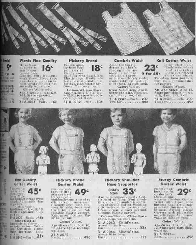 The Ward's ad copy read, "Famous quality Hose Supporters. Firmly sewn, long-wearing Lisle elastic tops. Easily adjustable rustproof metal fittings. Non-elastic pendants. Our very best. Colors: White, black. Age-Sizes 2-4, 4-6,
