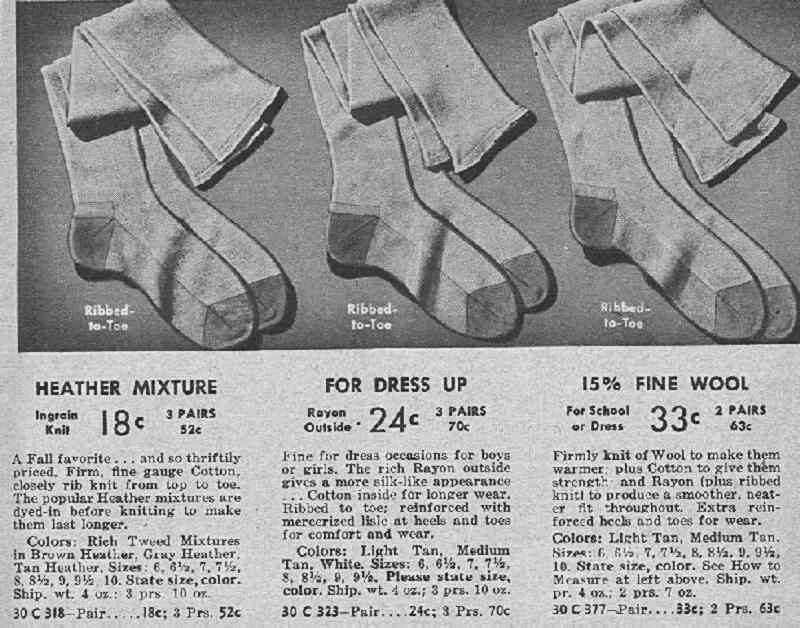 The 1939 Montgomery Wards offered a variety of different styles of long stockings for both boys and girls. They were availabble in sizes up to 9 1/2 or 10 years. They were still available in the dark brown and black which were the most common colors in the 1910s and early 20s. The new lighter brown/tan and grey colors were much more common. White was also available, but was not very popular with boys. Cotton had become the principal material, but rayon blends were available for dressy occasions. There was also a wool blend.