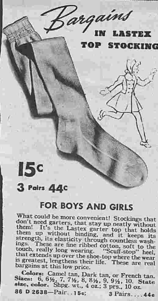 This advertisement below is for Sers long stockings with lastex knit-in garters. The Sears ad copy read, ""Bargains in Lastex Top Stockings" 15c. Three Pairs 44c. For Boys and Girls. What could be more convenient! Stockings that don't need garters, that stay up neatly without them! It's the Lastex garter top that holds them up without binding, and it keeps its strength, its elasticity through countless washings. These are fine ribbed cotton, soft to the touch, really long wearing. `Scuff-stop' heel that extends up over the shoe-top where the wear is greatest, lengthens their life. These are real bargains at this low price."