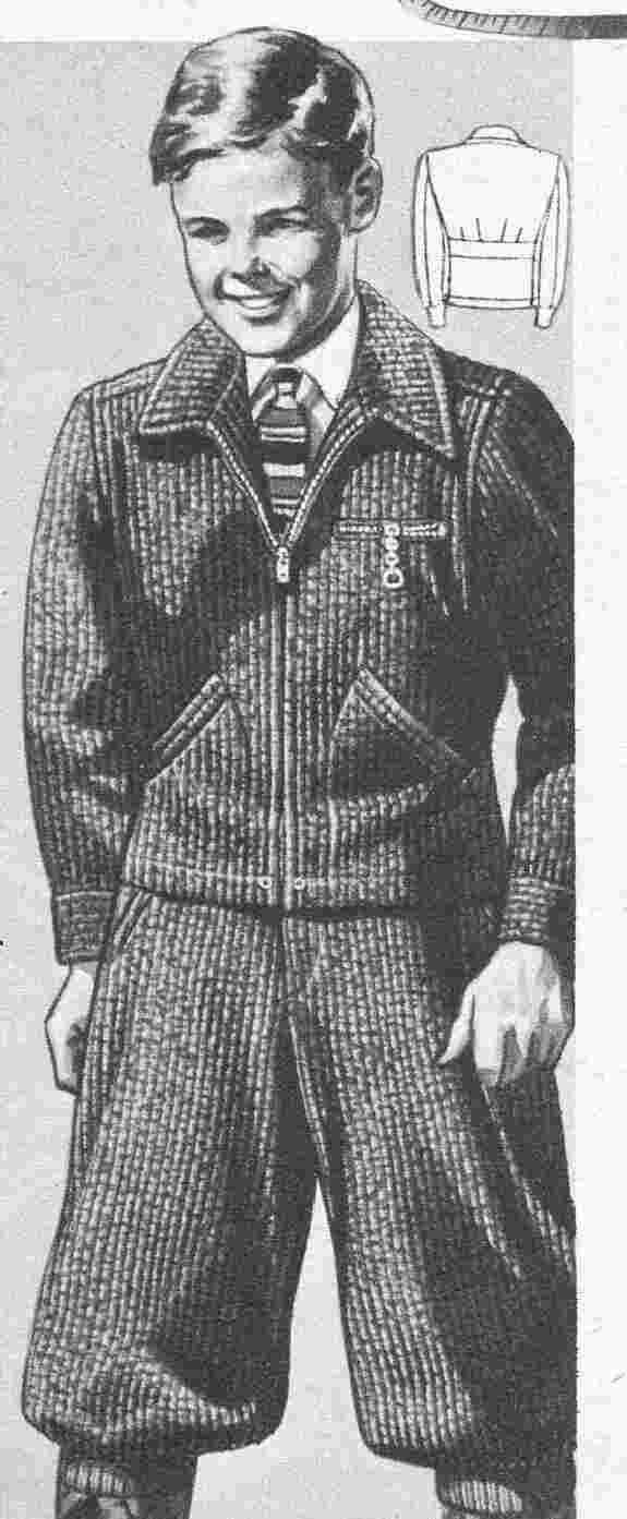 Sears offered this informal jacket in 1939-40. It was described as a Cossack style. It was as a set with matching fully lined knickers. The knickers had knit weave leg closings. These sets were seen as school outfits. One style was available in sizes 6-14 years. A similar set was mnade for boys 8-16. Both were done in corduroy.