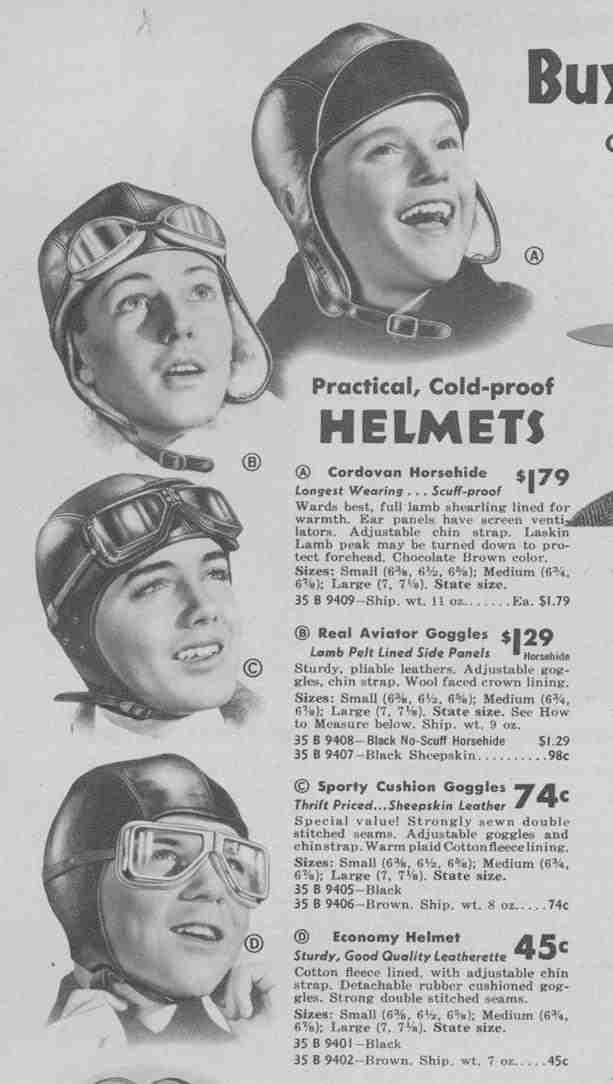 One interesting aspect of the Wards 1940-41 catalog headwear page is the selection of what are called "helmets" and goggles. We assume that this a reflection of the populariity od aviation and aviators. Wards describes them as "Practical, Cold-proof Helmets." We do note them being worn in the photographic record. We areunsure, however, just how popular they were. One note here. Unless it was really cold, boys often did not like wearing their ear flaps. It was seen by some older boys as does not hip or cool. This was affected somewhat by the themometer. Thus attitudes here probably varies between Minnesota and Mississipi. We are guessing that these helmet-type caps probably were most popular in the northern states. Note that the illustrations show the flps down, but these caps could be worn with flaps up as well. We are also guessing tht these caps would have been more popular with younger boys and were probably mostly seen in elementary (primary) school. I remember having one of the caps in the early 1950s and almost never wore it with the flaps down. Wards offered several different styles.