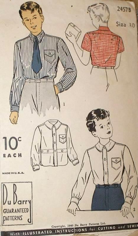 We note boys wearing both shirts and blouses in 1940, although blouses had become much less common for school age boys. Our modern shirt styles were clearly emerging in 1940. The soft pointed collar was the standard for school-age boys. We continue to see boys still wearing button-on shirts in 1940, but this style was becoming less common as more and more boys wore belts rather than the various other alternatives to trouser suspension. A good example is a size 10 du Barry pattern that could be used to make either a standard collared shirt or a button-on blouse. The shirt had a standard cillar and could be done as long or short-slleved garment. It is depicted as a striped or checked shirt, but mother could chose whatever fabric she so desired. The button-on blouse had a mock Eton collar. This style was used by younger boys when dressing up which is perhaps why it is depicted as a white blouse. Made with a standard collar they were worn to school, up to about age 10. It was depicted as a long-sleeved garment, but could also presumably be doine as a hort-sleeved garment. Du Barry was a trade brand name. The manufacturer was the Simplicity Pattern Company. The first DuBarry patterns appeared in the Woolworth five and dime stores (1931). They were made exclusively for sale by Woolworth. They continued to be sold at Wooworth through 1947.
