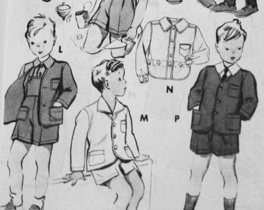 Macy's also offered actual jacket suits for the 2-6 year old range. They have short Eton jackets without lapels and there is one blouse with an Eton like collar. It has an Eton shape, but is not the actual large, stiff detachable collar known as an Eton collar. One of the suits has bib-front shorts. Yhis was not very common. Suspender shorts were common, but not bib-front shorts which were more of a play garment that dress pants worn with a suit jacket. But as Macy's explains, this was a three-way suit with multiple uses.