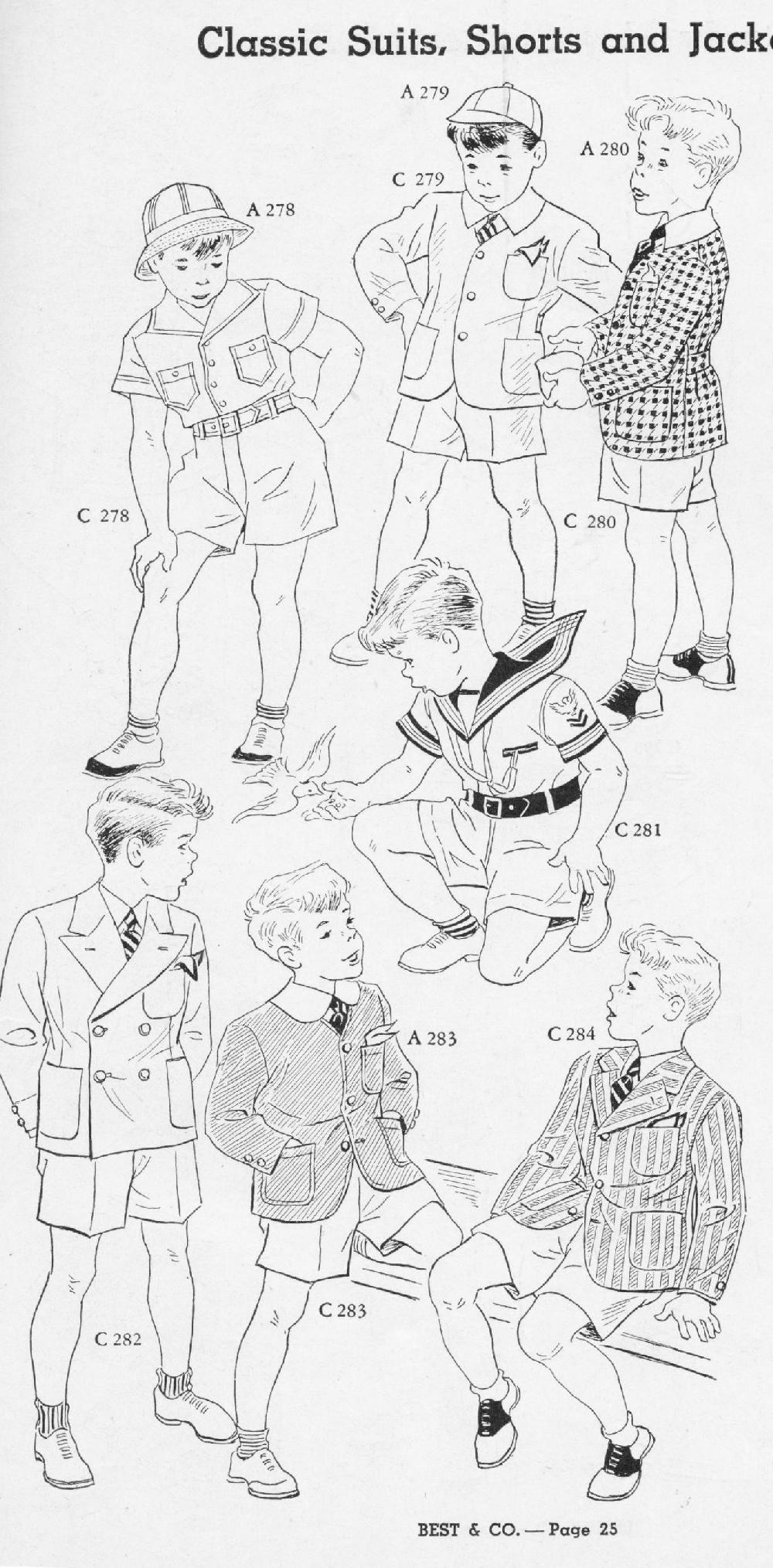 Suits declined in popularity during the 1930s. While they were still widely worn, fewer boys were wearing them than in the 1920s. And this trend continued in the 1940s. Single-breasted suits had become increasingly popular in the 1930s, although we still see some double-breasted suirs. Three-piece suits with vests were much less common. We see short pants, knickers, and long pants suits offered in catalogs and avrtising by 1940. The nix of these different types of suits had changed quite a bit in the 1930s. Most suits for school-age boys were long pants suits by 1940. Sears was still offering knicker suits in 1940. And there were some short pants suits for younger boys. Here there were social class differences. We still see some boys wearing Eton collars. We notice a Brooks Brother's magazine adverisement for primary (elementary school) school suits and shirts. We still see some boys wearing Eton collars. We notice a Brooks Brother's magazine adverisement for primary (elementary school) school suits and shirts. Brook's Brothers was a high end retailer of men and boys' clothing. The main store was in New York, but they by 1940 had stores in Boston, Los angeles, and San Francisco. We see quite a few Brooks Brothers magazine ads. These would presumably be be mostly for boys attending private school. By the 1940s, boys were no longer wearing suits at public elementary schools with a few exception. Parents had several options. We notice both Eton suis for younger boys in elementary school. Lapel jackets were vailble for older boys in elementary school and knickers as well as shorts. A Best Department Store summer catalog offered a range of outfits, mostly suits and blazer outfits for primary school boys (figure 1).