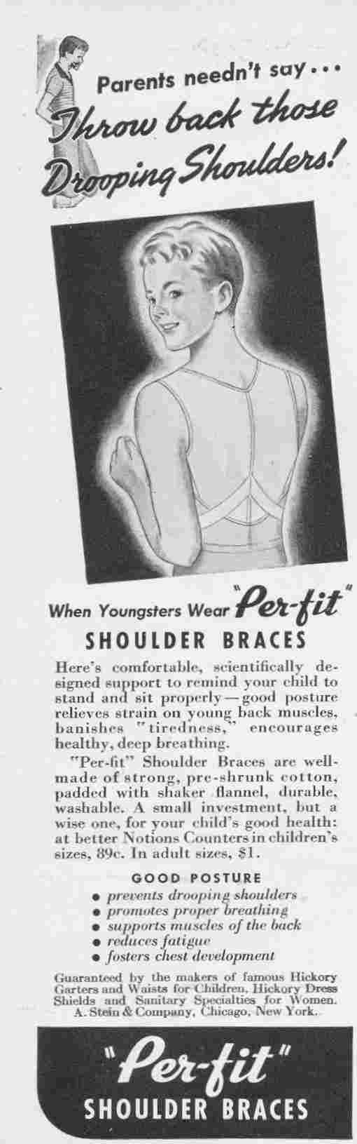 of "strong, pre-shrunk cotton, padded with shaker flannel". The boy in the illustration seems to be about 12 years old, but such shoulder braces were made for children of all ages as well as for adults. The ad copy read, "Parents needn't say . . . Throw back those Drooping Shoulders! When Youngsters Wear "Per-fit" Shoulder Braces. Here's comfortable, scientifically designed support to remind your child to stand and sit properly--good posture relives strain on young back muscles, banishes "tiredness," encourages healthy, deep breathing. "Per-fit" Shoulder Braces are well-made of strong, pre-shrunk cotton, padded with shaker flannel, durable washable. A small