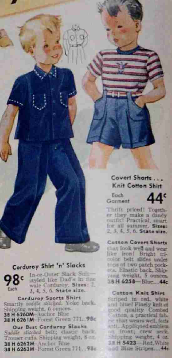 While corduroy shorts were common in Britain.  Corduroy was commonly used for knickers and after the 30s long pants, but crarely used for shorts.  The Sears ad copy read, "Saddle stiched belt; elastic back.  Trouser cuffs."    It was done in anchor blue (shown) and forrest green.  The price was 98c.