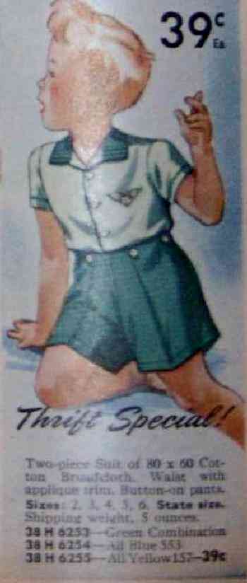 Sears offered one shorts set at an especially low price.  The ad copy read, "Two-piece Suit of 100x60 Cotton Broadcloth. Waiste with applique trim.  Button-on pants."  Sizes 2-6.  The set was done in green cobination (shown), all blue, and all yellow.  The price was 39c.