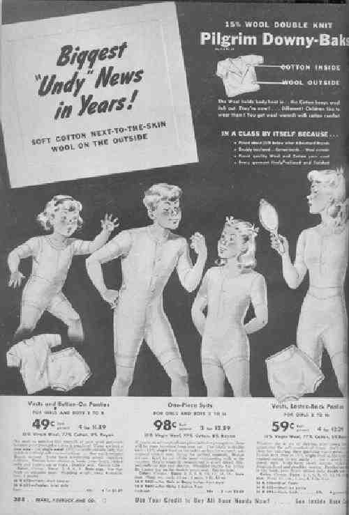 The page was entitled, "Biggest 'Undy' News in Years! Soft Cotton Next-to-the Skin, Wool on the Outside. 15% Wool Double Knit: Downy-Baks: -- Cotton Inside, -- Wool Outside. The Wools holds body heat in...the Cotton keeps wool itch out. They're new ... Different Children like to wear them! You get wool warmth with cotton comfort. In a Class by itself because ... -- Priced about 23% below other Advertised Brands Doubly insulated, -- Cotton inside, -- Wool outside Finest quality Wool and Cotton yarn used, -- Every garment finely tailored and finished."