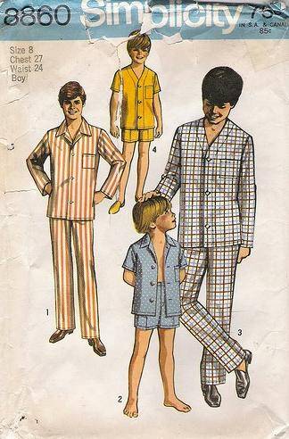 We notice Simplicity patterns for boy's pajamas. There were different options including the collar and sleeve and leg length. Patterns are more diffucult to date than catalogs. This was in part the case because the pattern compsanies did not want to date their patterns so that buyers would not reject them in the new year. We believe these patterns were from the 1970s.