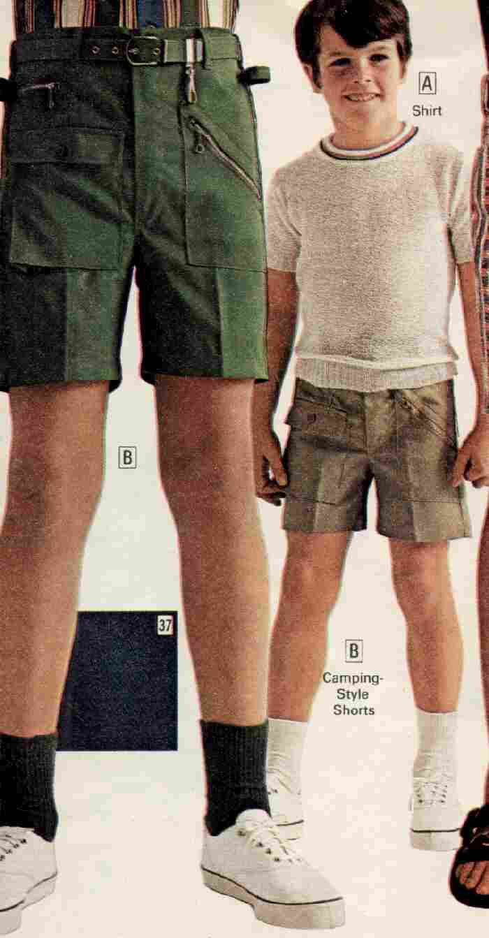 Camp shorts were one of the most popular types of short pants in the 1970s. They were worn by boys of a wide range of ages. All the major mail order catalogs offered camp shorts in 1971. Penney called them "camping style shorts". They were stylistic differences among the shorts offered. The Penney's camp shorts seem to be cut a little shorter than the Sears camp shorts. We note a 1971 Penney's ad for pogo sticks. the boy on the pogo stick is illustrated wearing camp shorts.