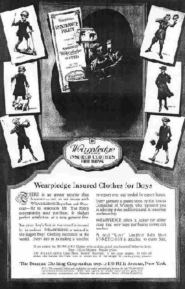 The Bauman ad copy read, "Wearpledge Insured Clothes for Boys. There is no greater security than Insurance--and so we insure each Wearpledge Boy's Suit and