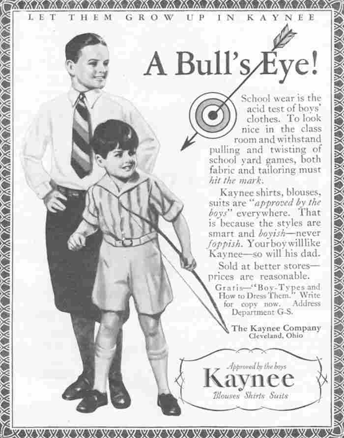 The company advertised in important national magaazines. We notice an advertisement for boys' school clothes in Good Housekeeping Magazine (September, 1927, p. 234) (figure 1). Interestingly the younger boy wears shorts with knee socks while the older boy wears knickers with what look like black long stockings. The ad copy here read, "Let Themn Grow Up in Kaynee. A Bull's Eye! School wear is the acid test of boys' clothes. To look nice in the class room and withstand pulling and twisting of school yard games, both fabric and tailoring must hit the mark. Kaynee shirts, blouses, suits are "approved by the boys" everywhere. That is because the styles are smart and boyish--never foppish. Your boy will like Kaynee--so will his dad. Sold at better sores--prices are reasonable. Gratis--"Boy-Types and How to Dress them." Write for copy now. Address Department G-S. The Kaynee Company, Cleveland, Ohio. Approved by the boys--Kaynee Blouses, Shirts, Suits." Notice the reference to foppish clothes. Presumanly this is a reaction to fancy clothes like Lottle Lord Fauntleroy suits. Noctice the booklet offered by the company. This would provide all sorts of interesting information about 1920s clothing. Unfortunately, we do not have a copy.