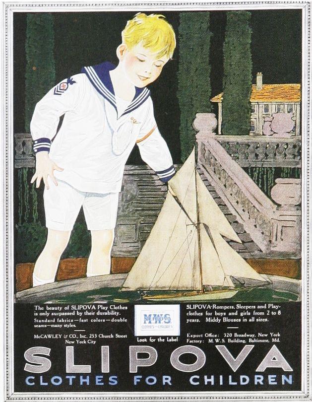 McCawley was an American clothing manufacturer. We do not know much about the company other than their offices including an export office were located in New York and manufacturing facilities in Baltimore. Nothing comes up on internet searches. We do know that they had a line of playclothes for younger children marketed under the Slipova brand. This also produces nothing on internet seaches othr than sample advertisements. We do note a music piece, but are unsure if they are related. We believe Slipova that was meant to convey 'slip over' clothes which made dressing younger chidrn easy. We note advertisements during the 1920s for rompers, sleepers, and play clothes for younger children from 2-8 years of age. Some were beautiful color ads in major magazines like Ladies Home Journal. They were some of the earliest major color advertisement for children's clothing that we have noted. The company also made middy blouses. The image here is undated, but probably came from the early-1920s as we seeseveral Slopova ads from this period. The ad copy read, "The beauty of SLIPOVA Play Clothes is only surpassed by their durability. Standard fabrics -- fast colors --double eams -- many styles." The 2-8 year age range meant clothes for todler, pre-schiilers, and early-primary children, We do not have further inforation on Slipova and only notice their ads in the 1920s. Ac good example is one of the ads with a romper illustration in the Saturday Evening Post, a major mass market magazine.