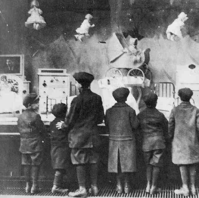 Some available images show children viewing store windows. This provides additional fashion information. The photograph here shows a group of boys looking at the widow display of a department store, perhaps Macy's, decorated for Christmas in 1910 (figure 1). It seems a strange wndow for the boys to be looking at the window has baby and girl things in it. The smaller boys seem to wear knee pants whereas the older boys wear knickers. They all wear caps and hightop shoes.