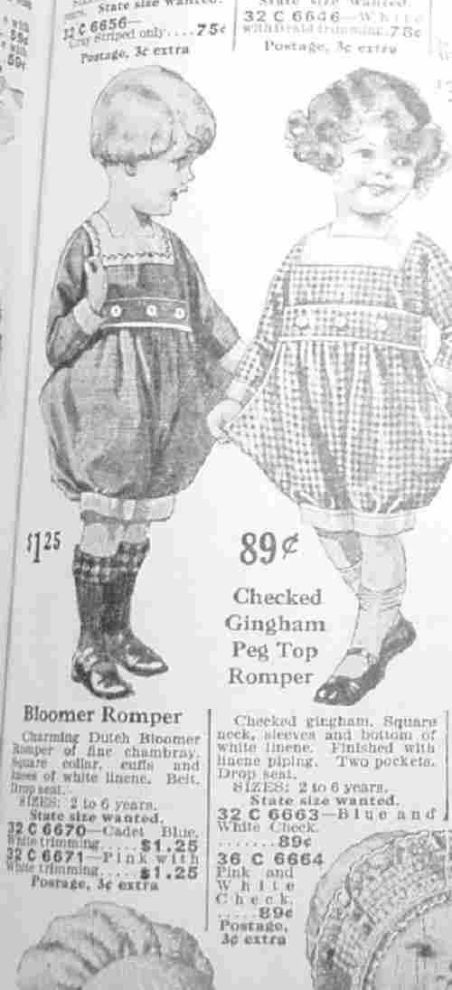 Best & Co., a New York department store offered a variety of romper suits in its 1912 catalog. There were both boys' and children's (Boy and girl) romper suits. The children's rompers had pink or blue color options, suggestong gender-based color options. The ad copy did not, however, specifically state that these were gender appropriate options. One boys' romper suit also had pink as a color option.