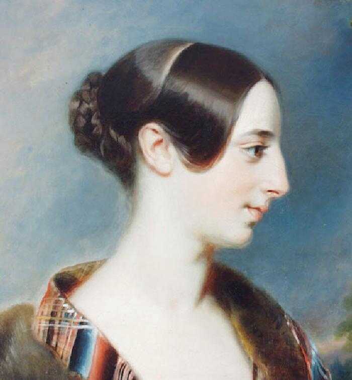 Bonnets were important in the 1840s. Some had deep brims which could be used to almost hide the face. Women wore floor-length dresses with bell-shaped skirts. There were various styles of collars, but most tended to be white. The sleeves on dresses varied, but were often narrow. The dress bodices tended to be long and tight with buttons to close in the back. Under their dresses were mumerous layers of petticoats. Women also wore constrictive corsets to create a more narrow waistline. A popular garment worn over the dress was an elbow-length cape referred to as a pelerine. A popular adornment was a ribbon around the neck as well as at the waistline. Prosperous women might add a gold watch on a gold chain or black cord. Girls wore shorter-length dresses, but with ankle-length pantlettes covering their legs. Neck ribbons were less common for girls, but waist ribbons on their dresses were very common. Some dresses has open necklines without collars. Girls lokes their mothers wore might wear layers of ptticoats. Center hair parts were very common for women and girls often with the hair drawn back covering the ears. Girls often instead of having the hair drawn back might have ringlets curls of varying length.