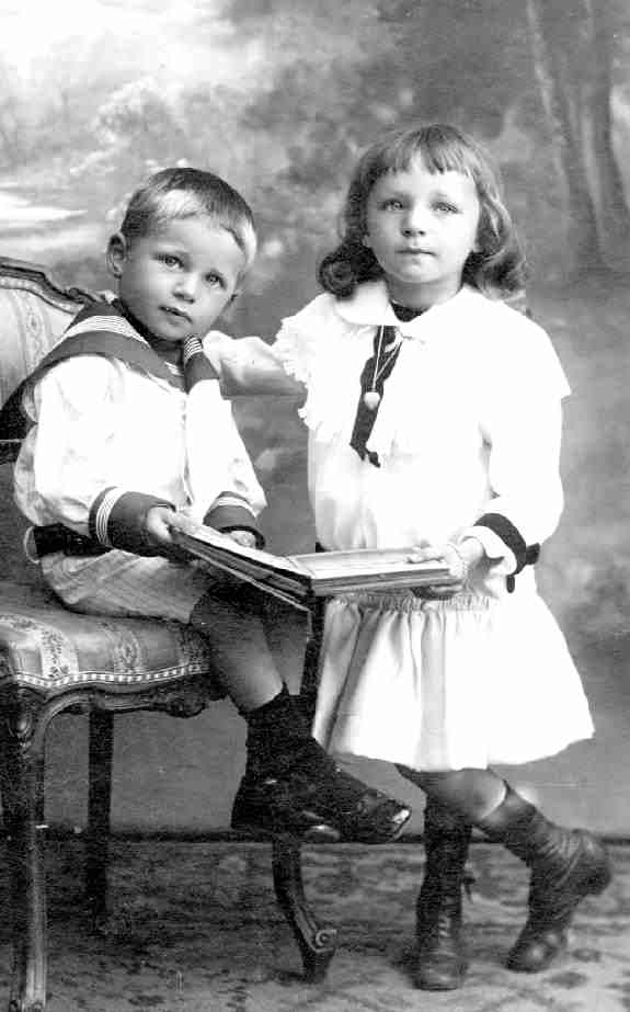 About 1910: Girl in a colored pinafore and short hair: American brothers and sister