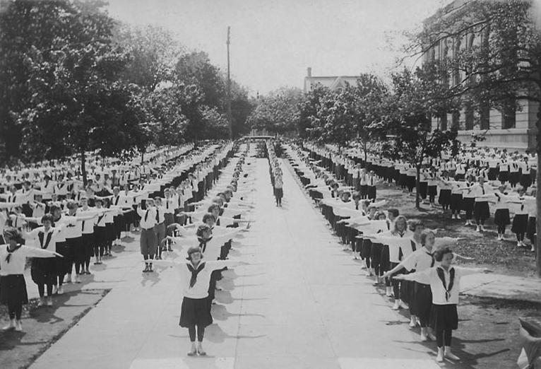 Boys at first wore their regular clothes. This was not possible for the girls. Less restrictive garments for gym were needed and the result was gym uniforms. We suspect this developed in part because the schools wanted to carefully control what the girls wore for gym, more so than for the boys. Many schools adopted middly blouses, voluminous bloomers, and black long stockings for the girls. These outfits were common until after World war I into the inter-War era. Gradually we see these outfits replaced with one-piece romper outfits. The bloomer-likr romper pants gradually were relaced with short pants. And evenentually the girls began wearing T-Shirts and -short pants like the boys wore.