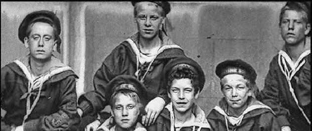 We note a group called the Marine Society. We do not know much about it at this time. We do not know when the institutiin was founded nor who funded and administered it. It worked with at risk boys before they got into serious trouble. The were presumably boys without home or at least stable homes. One photograph shows a group of barefoot, perhaps working boys if they can find jobs. As they are barefoot presumably they hasvevnot. The group apparently is the before picture of a group to be resuced ny the Marine Society. The Marine Society was a charitable group who rescued boys from the street. They apparently were boys that were not yet committed to reforatories, aslthough I do not know if participation was entirely volunary. The boy in the centre can be seen in an after photo showing a group of Marine Society boys. We have few details on the group and who sponsored them. Nor do we know if they were a residential progream or more like a youth group.