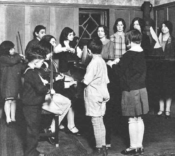 Settlement Houses offered a wide range of services to immigrants. The services were intended to help immigrants adjust and integrate into American society. The integration factor was not always readily apparent. But proiding the type of cultural and entertaiment activities that Americans engaged in helped to promote integration, especially because the language used at the settlement houses was English. (Immigrants from different countries had to use English to speak with each other.) There were classrooms to teach a range of subjects, often focusing on English and domestic skills like cooking and sewing. There were shelters for the homeless or abused women. There was also a strong cultural component. Plays were organized as well as orchestras. Here we see children at Hull House preparing for a concert (figure 1). There were also other entertaiments for children as well as sports activities sponsored.