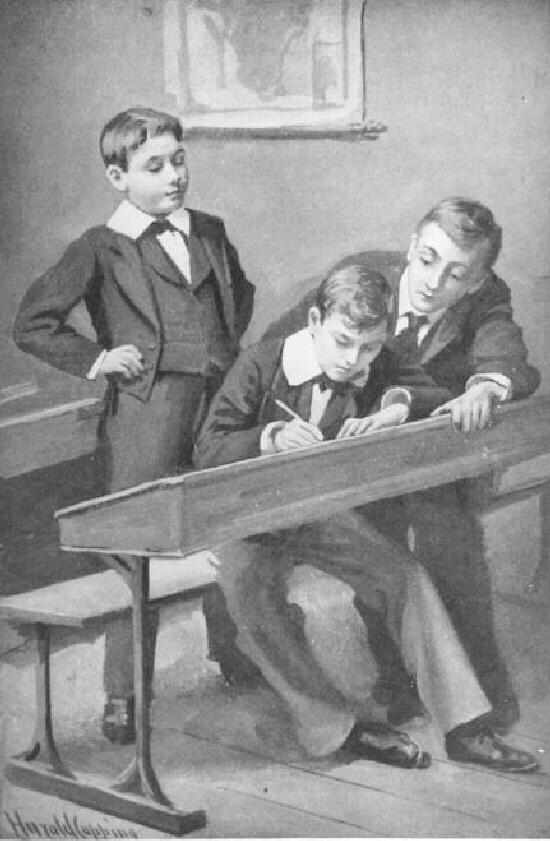 The illustrations are by Harold Copping. He is one of the most noted illustrators of school stories. Copping's beautiful and pensive artwork was a common feature of publications during this time. Unlike the similar but stark illustrations of J.R. Burgess, Coppings art is far less strident in the interpretation of a scene with the subtle and finer expressions of the boys faces far more unrestrained and gentle with an endearing element of wistfulness. The natural and nascent fluidity of the boys postures look totally at one with Coppings accurate depiction of schoolwear of that time.