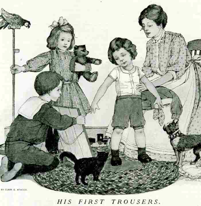 The illustration here shows a boy of about 3 years old getting his first trousers and admiring them in a mirror held by his older brother. The trousers are above-the-knee style knickers. Notice that the boy wears an underwaist over this other underwear. This buttons down the front like a vest and has strap reinforcements under the arms to which the new knickers are fastened. The boy is still young enough (about 2 1/2 or 3 years old) to wear short socks. His older brother, who appears to be about 7 or 8, wears knee pants with long black stockings--the standard trousers for older boys. The ceremony of fitting out the boy with his first trousers is depicted here as something of a family ceremony involving all of the