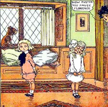 cartoons. Basically they involved some innocent prank and how Buster got into trouble. A key part of the strip was Buster being punished for his micheviousness. The strip was in many ways a mini-morality play. I know that they the strip sometimes touched upon clothing and hair styles. I do not think, however, that Buster ever got teased by his friends--but they clearly did not want to wear one of his suits. Some sample plot lines include the following. "Buster Brown's Sweetheart" (Buster Brown, 1906 Sunday) R. F. Outcault. Jane is coming, so Buster gives Tige a bath in the bathtub. He Fools Tige" (Buster Brown, 1906 Sunday) / R. F. Outcault. Buster puts a wolf skin rug on the floor, and Tige