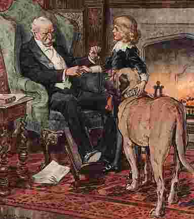 Figure 1.--This color C.E. Brock plate shows Cedric in a blue velvet suit when he firsrt met the Earl, his grandfather. |