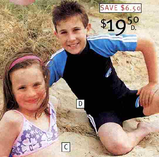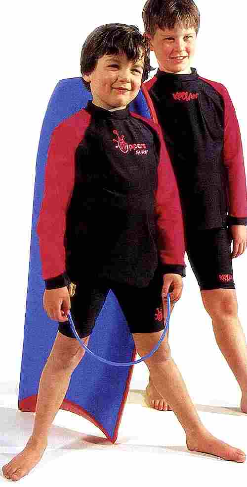 sunsuit, which has long sleeves and short legs, and sometimes you see kids wearing the sunsuit that looks like a steamer with long sleeves and long legs. These normally have the zipper up the back with a piece of string to grab hold of it. Some kids wear their speedos underneath there sunsuits, but most dont bother , just wearing the sunsuit as a swimming costume. Kids who dont want to wear the sunsuit wear a rashie. With the rashie they wear speedos, boardies or bike shorts, or with a long sleeve rashie some boys will even wear footless lycra tights or