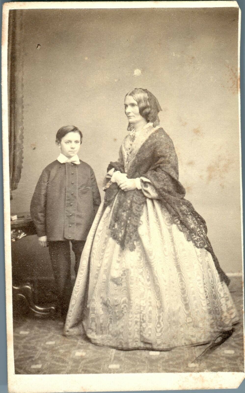 The CDV first appeared (mid-1850s), but did not become popular for some time. The CDV was invented in France. It is only gradually that we begin to see substantial numbers (1860s). This occurred at about the same time in America, Britain, and France. We are not exactly sure why the CDV was not immediately popular or why it suddenly becam popular. But in Scotland like all countries including France), there are vert few CDVs from the 1850s and suddenly quite a number from the 1860s. Early CVDVs are easy to spot because they do not have any of the studio information on the frontthat became so common as wse see here (figure 1). Rather there was no studio ibforanmtion or it was stamped on the bank in ink. This is not absolutely true, but is a very good chrnological indicator. It is also vital in identifying where these photographs are from. Almost laways we have no information as to provinance except the stydio infotmation. And the style of the studio information is also helpful in dating the CDV. Most of the portraits we have found through the 1870s were CDVs. We do not know why CDVs persisted longer in Scotland and England than in America. The same was true of Europe generally. We continue to find CDV examples into the 1890s while it had largely gone out of style in many other countries. We are not yet sure about the 1900s, but suspect there were still a few.