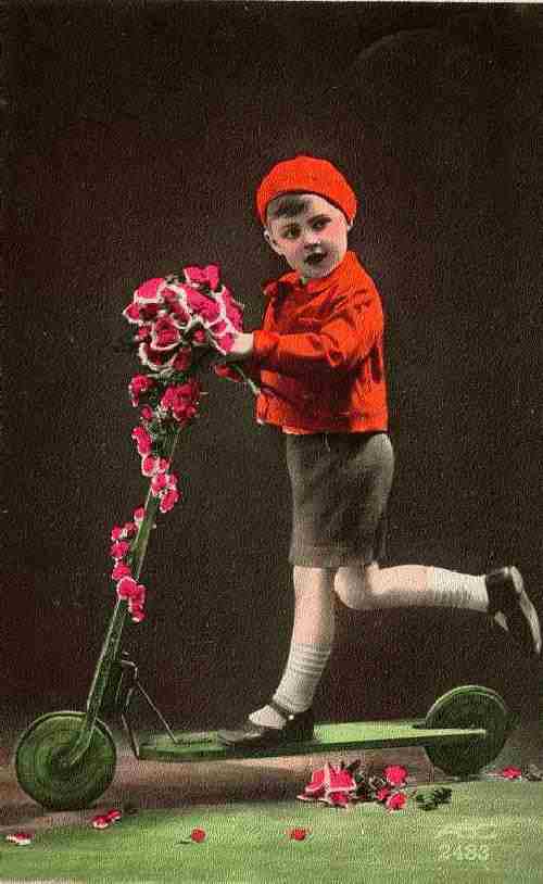Color post cards were introduced before there were practical color photographic processes or economical ways of printing color images. Many French postcards from the 1900s and 1910s were black and white photographs that had color painted in. Color was very appealing to a then black and white world and these painted images proved very popular. I'm not sure just what the printing process was. A lot of the postcards of children were printed in this manner. The question is, how accuate are the colors. HBC believes that they were not very accurate at all. While a great deal of useful information can be gleaned from these postcards, we do not believe that realiable information on the the color of the outfits boys wore is among the information that can be used. We know this not only because many cards had unrealistic colors, but also we have the same or similar card painted in different colors. Some of these cards were colorized in great volume. The person or firm doing the coloring probably has no idea what the boy was actually wearing. The colors on many cards appear to have colorized to attract the eye of potential customers rather than to accuartely record the boy's outfit. HBC is just speculating at this time, but would like to know more about how the various colors appearing on these cards were selected. Was it up to the artist, or was he given instructions by the postcard company.